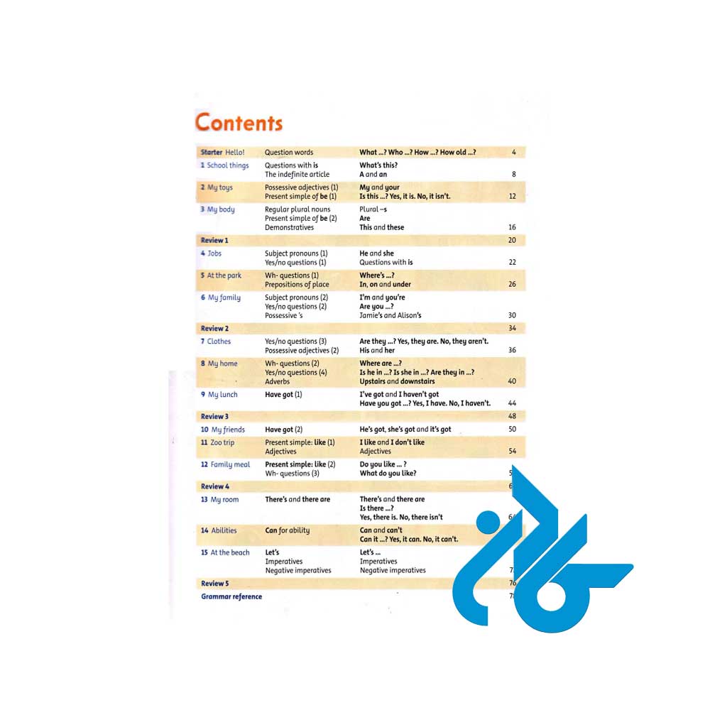 کتاب Grammar Friends 1 شامل 15 درس اصلی است که به ترتیب موضوعات پایهی دستور زبان انگلیسی را آموزش میدهد. ساختار هر درس کوتاه، شفاف و با تمرکز بر درک مفهومی طراحی شده است.