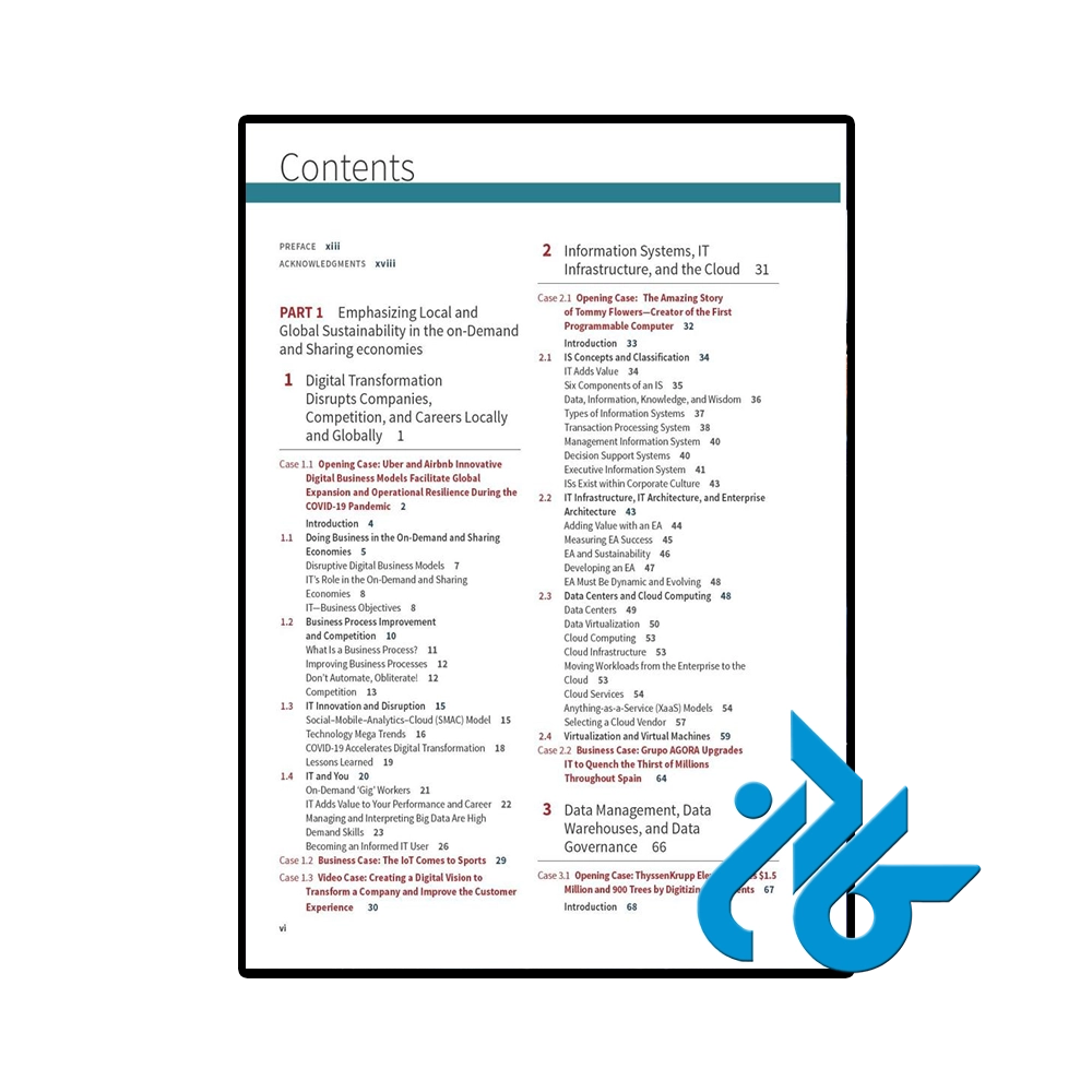 محتوای کتاب Information Technology for Management 12th در بخشهای مختلفی تنظیم شده که هر بخش یکی از جنبههای کلیدی ارتباط میان فناوری و مدیریت را پوشش میدهد. فصلهایی چون مدیریت سیستمهای اطلاعاتی در سازمانها، زیرساختهای دیجیتال، دادهکاوی و تحلیل پیشبینانه، امنیت سایبری، تجارت الکترونیک و نوآوری فناورانه ساختار کلی آن را تشکیل میدهند. در نسخهی دوازدهم، توجه ویژهای به تحول دیجیتال و استراتژیهای نوین IT شده است؛ از جمله بررسی نقش فناوریهای نوظهور مانند هوش مصنوعی، بلاکچین، اینترنت اشیا (IoT) و رایانش ابری در بازطراحی مدلهای کسبوکار. هر فصل با مثالهای واقعی، مطالعات موردی و پرسشهای تحلیلی پایان مییابد که دانشجویان را به تفکر انتقادی و تصمیمگیری مدیریتی مبتنی بر داده تشویق میکند.
