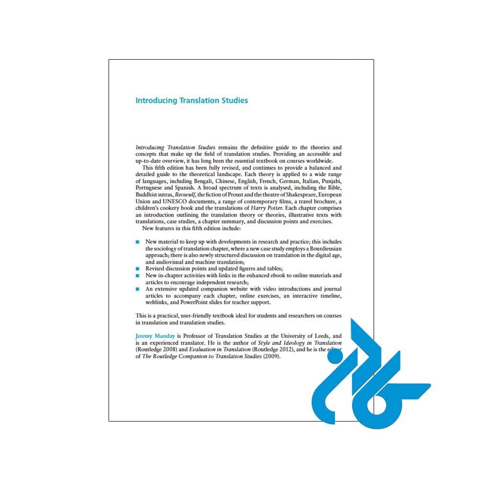 کتاب Introducing Translation Studies 5th، موجود در انتشارات کادن، نوشته‌ی *Jeremy Munday* با همکاری *Sara Ramos Pinto* و *Jacob Blakesley* یکی از جامع‌ترین و معتبرترین منابع در حوزه‌ی *مطالعات ترجمه* است. کتاب Introducing Translation Studies: Theories and Applications توسط انتشارات *Routledge* منتشر شده و در بسیاری از دانشگاه‌ها و دوره‌های تخصصی ترجمه در سراسر جهان تدریس می‌شود.