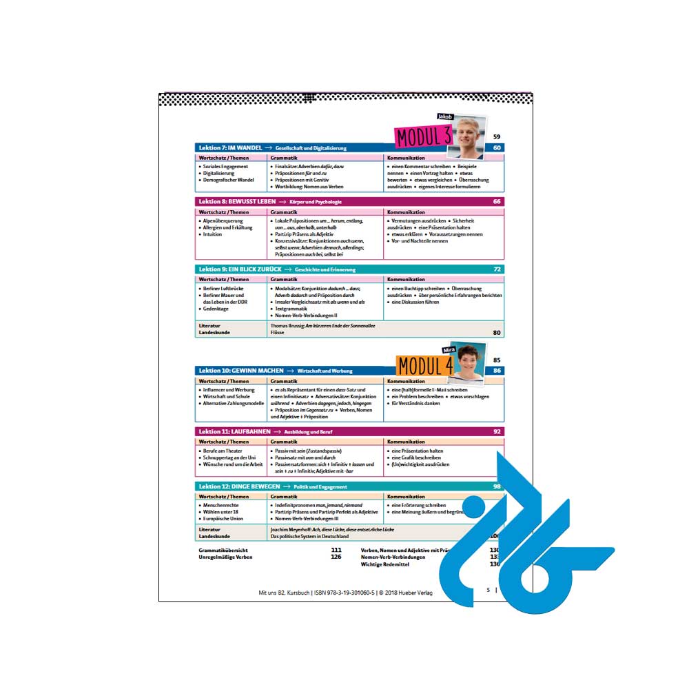 کتاب Mit uns B2 چهار مهارت اصلی زبان را در قالب درسهای متنوع پوشش میدهد: